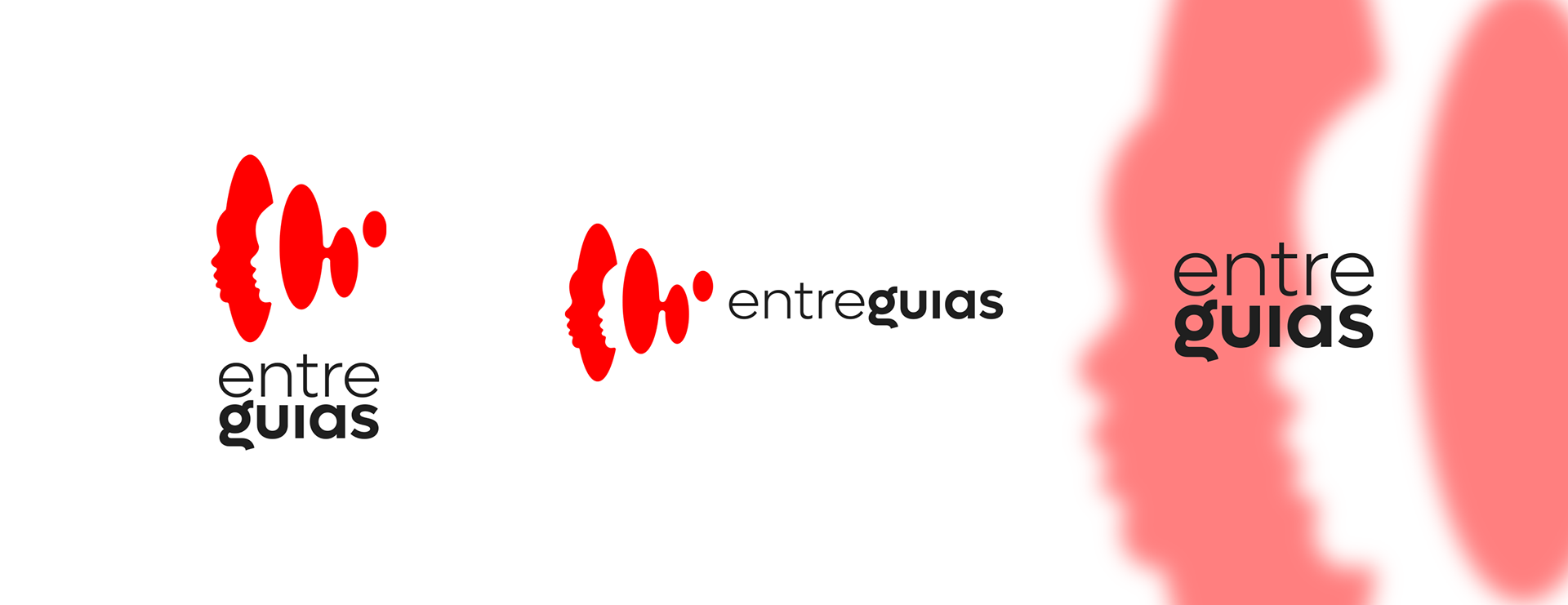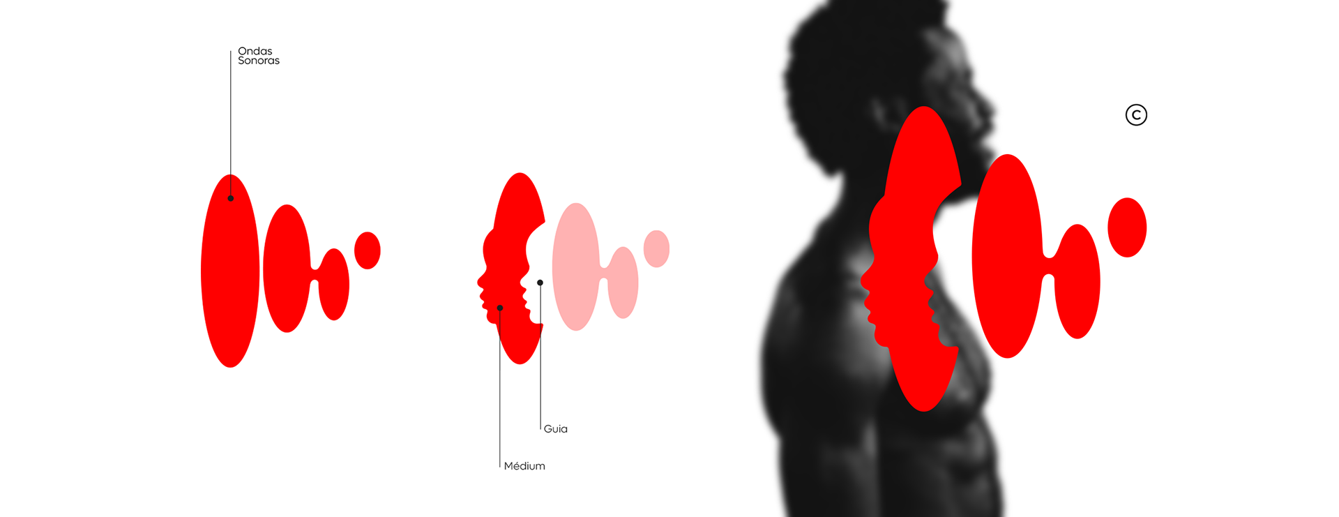 A identidade visual foi construída a partir do conceito de mediação entre mundos. O símbolo central representa dois perfis voltados um para o outro, evocando diálogo, escuta e a presença dos guias espirituais. As formas orgânicas criam uma sensação de fluxo e vibração, remetendo à voz, à energia e à transmissão do conhecimento ancestral. A cor vermelha simboliza força, vitalidade e axé, elementos fundamentais nas tradições afro-brasileiras.